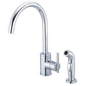 Single Handle Kitchen Faucet . High-rise swivel spout. 360 Degree handle placement. Includes matching brass spray. Ceramic Disc Cartridge.