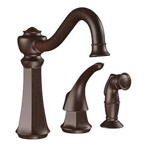 Finish:Oil Rubbed Bronze Includes matching traditional side spray. Features solid lever handle and pivoting spout. Metal construction with 8' supplies Spout reach is 10'. For 3 hole installation, 1' min. diameter each. Aerator is limited to 2.2 gpm (8.3 L/min) maximum flow rate. ' IPS connections Moen Lifetime Limited Warranty against leaks, drips and finish defects. All Stainless faucet components feature the LifeShine Non-Tarnish finish.